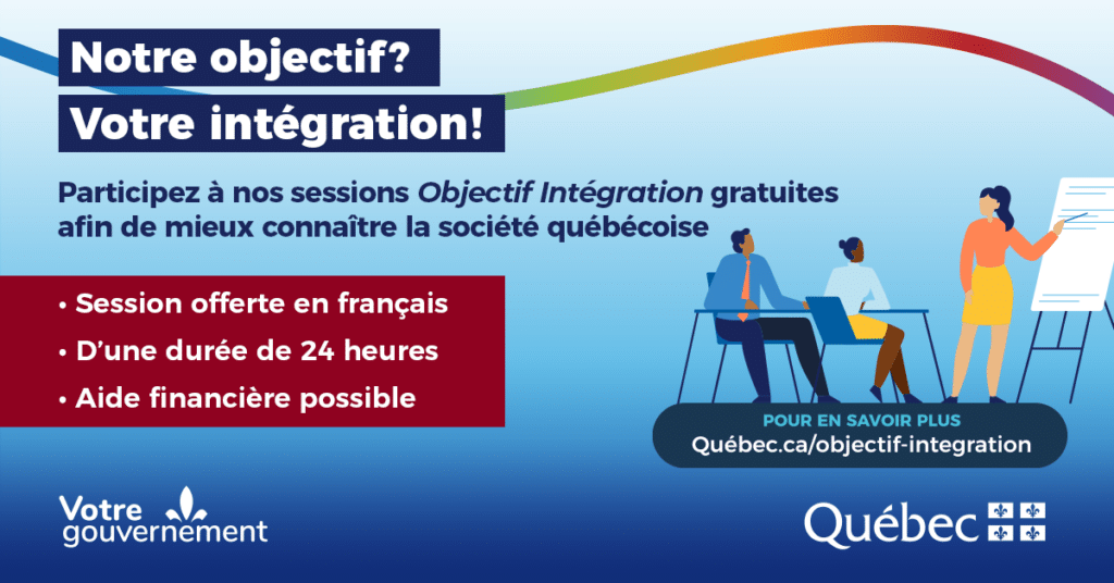 The Objectif Intégration information session targets immigrants. It helps them become familiar with democratic and Quebec values, cultural norms, and the local job market. The session is free and conducted only in French. Participants who complete the full Objectif Intégration session receive a certificate of participation and a recognition of democratic and Quebec values as expressed by the Charter of Human Rights and Freedoms. This certificate is valid for two years. There is also a possibility of receiving financial assistance of $230.