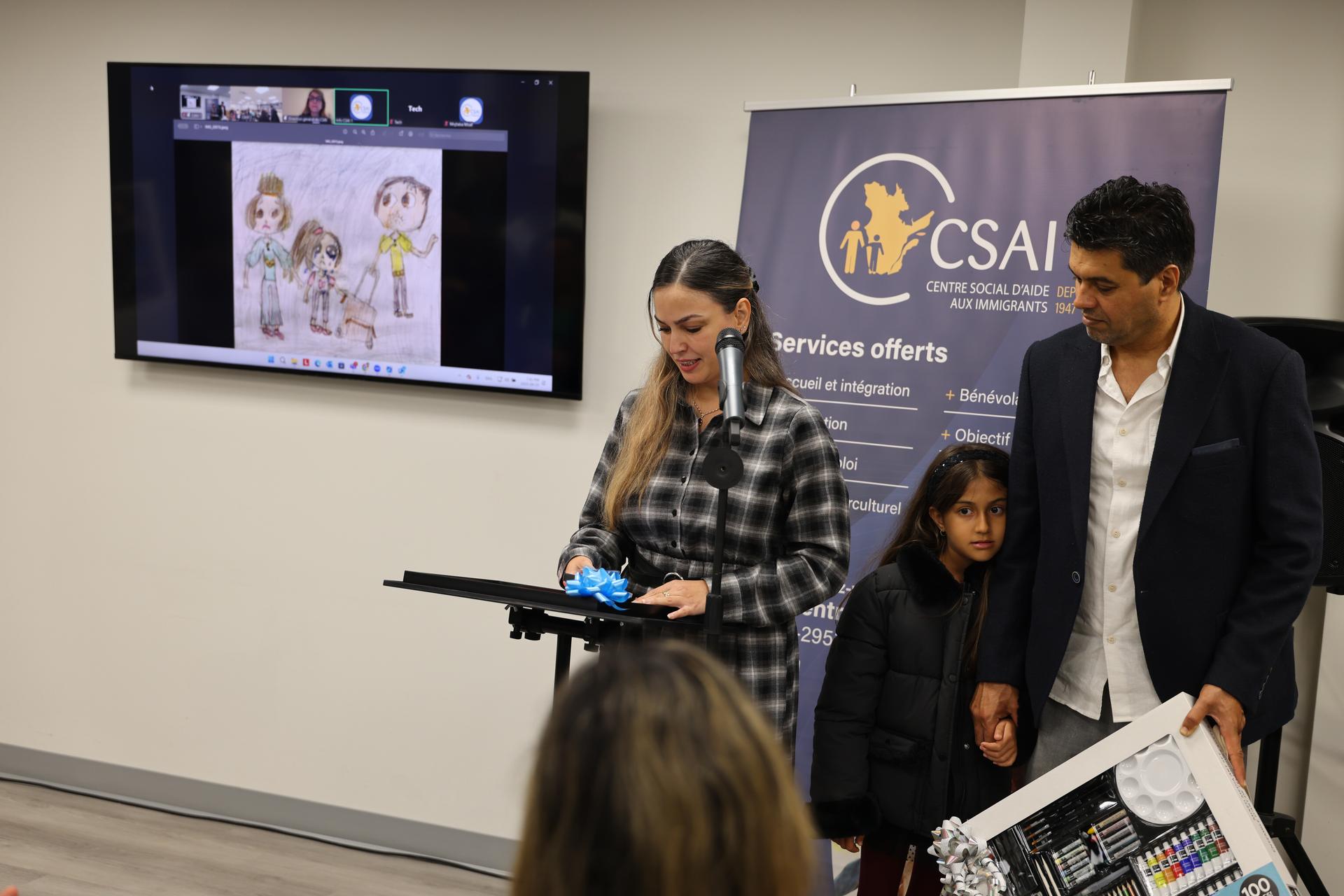 📸 𝗨𝗻 𝗺𝗼𝗺𝗲𝗻𝘁 𝗲́𝗺𝗼𝘂𝘃𝗮𝗻𝘁 : lors de la soirée, le prix spécial du concours de photos du CSAI a été remis à une jeune participante de sept ans. Trop jeune pour soumettre une photo, Iryana avait choisi de dessiner le souvenir de son dernier regard vers son père avant de quitter son pays pour le Canada — un dessin simple, empreint de nostalgie mais aussi d’espoir. Quelques mois plus tard, grâce à la persévérance de sa mère, à sa propre résilience et à l’accompagnement du CSAI, la famille a été réunie. L’œuvre de Iryana, à la fois touchante et inspirante, s’est imposée aux yeux du comité comme le plus bel « instantané » de ce concours.